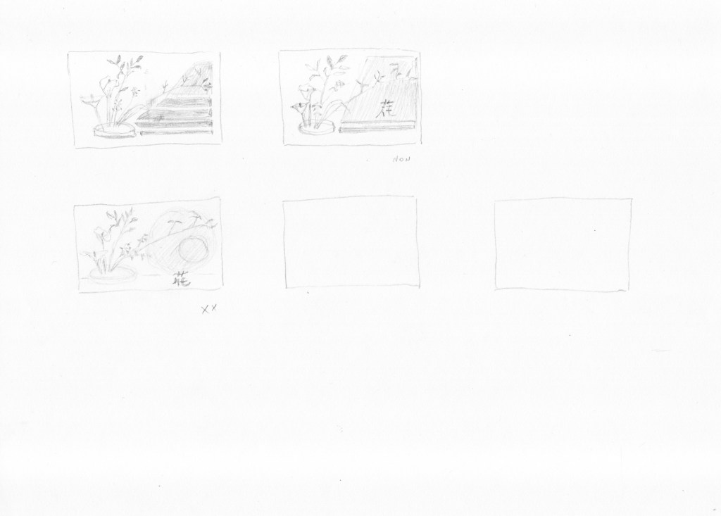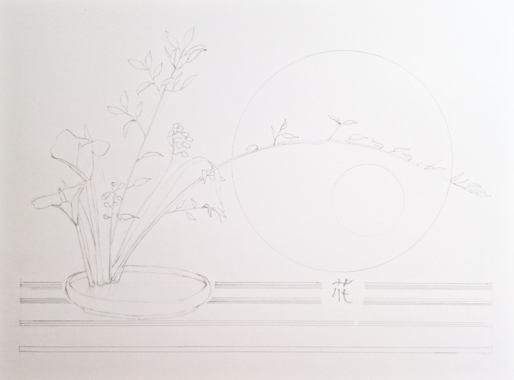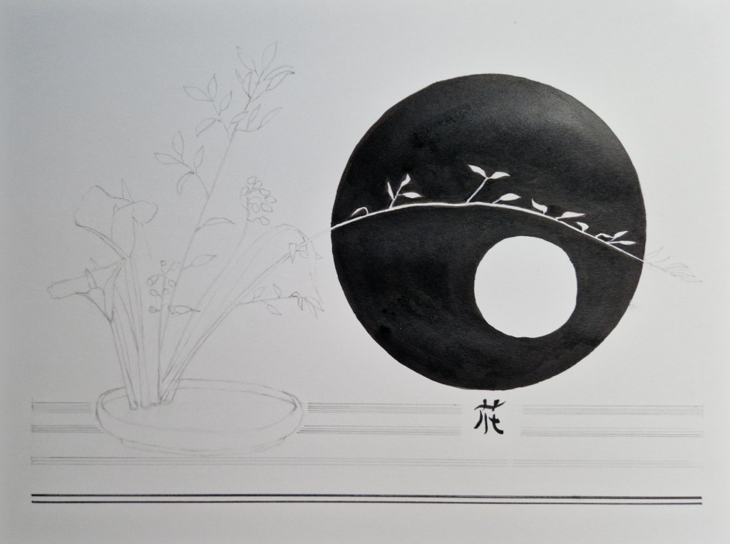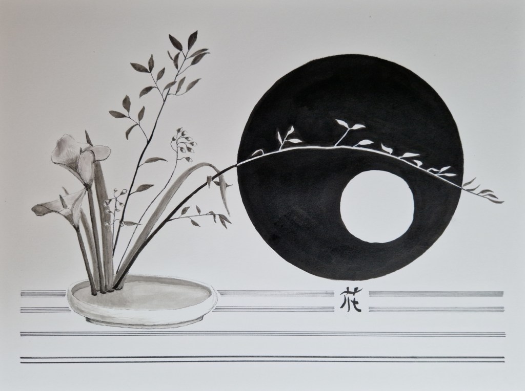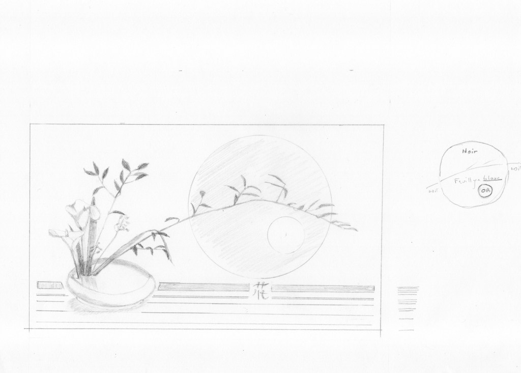 J’ai choisi un thème « japonisant » et me suis inspiré d’une photo de composition florale Ikebana ; j’ai également trouvé sur Internet le kanji japonais « hana », c’est à dire fleur. Les puristes remarqueront que j’ai fait une erreur en le reproduisant, mais quand on dessine à l’encre de Chine, pas de correction possible…