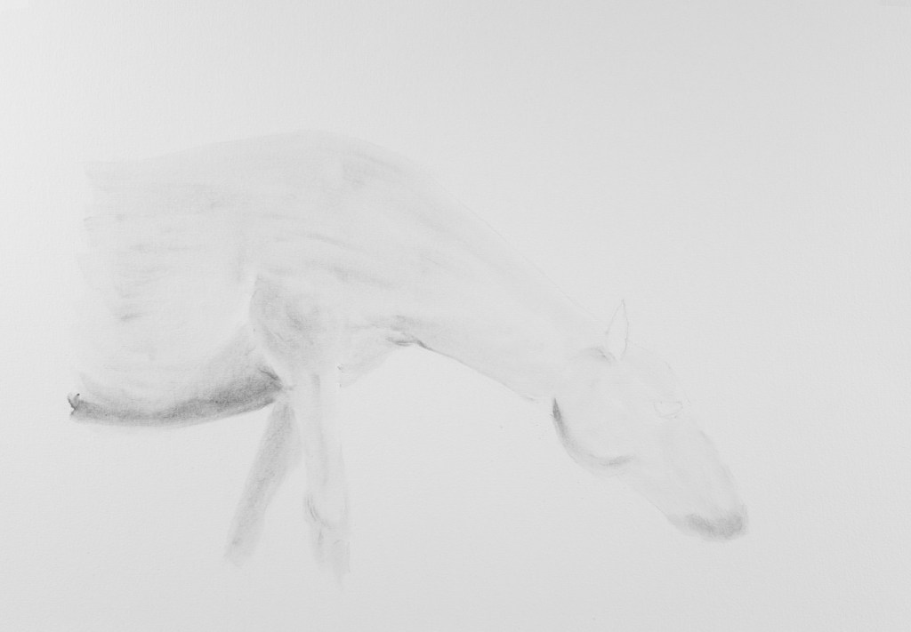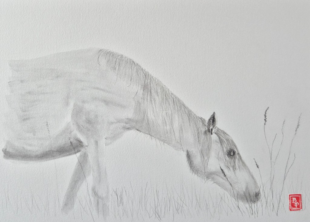 Comme souvent je ne suis pas entièrement satisfait et vois après coup les défauts de l’oeuvre. Défauts de dessin : proportions de l’encolure et de la tête qui devraient être plus massives. Défauts d’exécution : le point focal est sur l’encolure et la tête et je n’aurais pas dû dessiner complètement le reste du corps, le suggérer davantage.