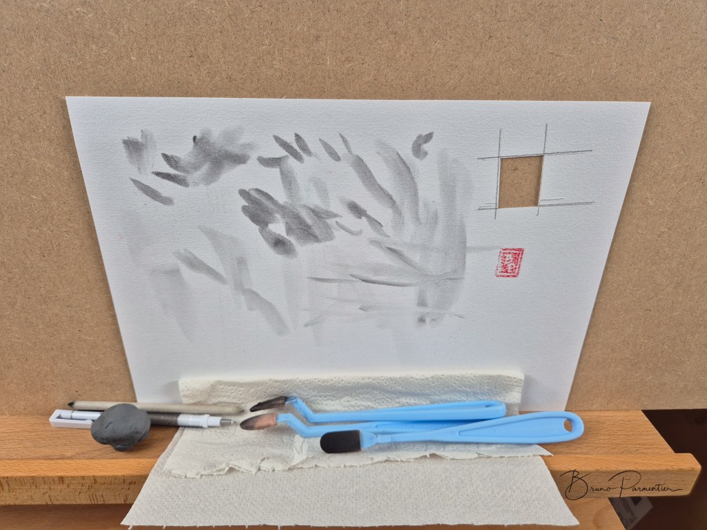 J’ai beaucoup apprécié sa technique et me suis efforcé de la suivre : il place les valeurs et volumes en utilisant de la poudre de fusain posée à l’applicateur mousse. Une fois satisfait, il fixe ce fond, afin qu’il ne bouge pas lors de la suite. Pour achever le dessin, il ajoute des détails au fusain (bâtons et crayons), mais sur une partie seulement, le « point focal », celui qui va attirer l’oeil du spectateur.