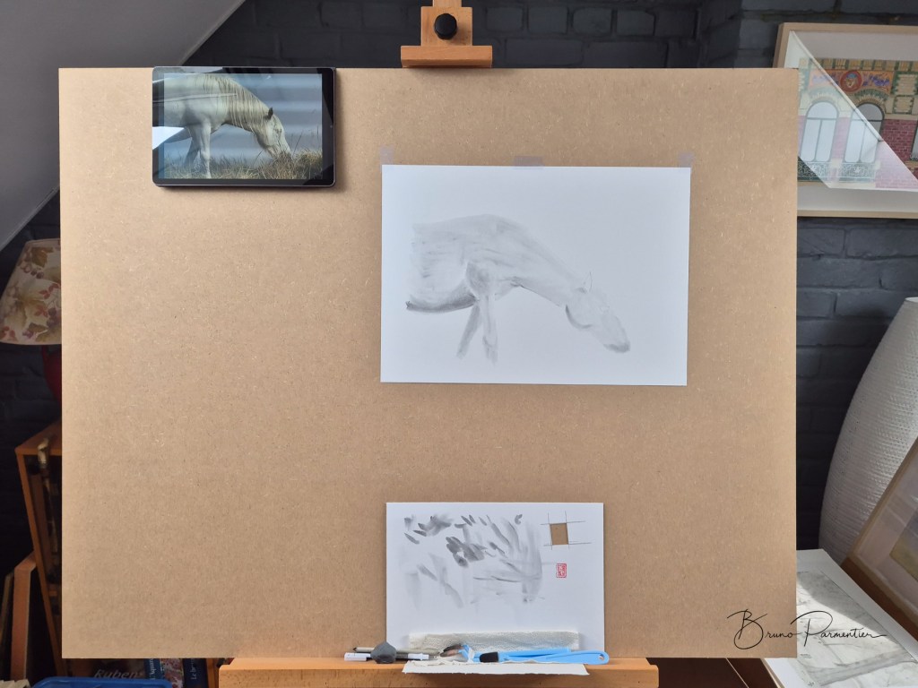 J’avais fait un premier essai avec un pot de grès. Dans le cadre de ce cours, j’ai réalisé un héron et je viens de m’y remettre en dessinant un cheval, le tout d’après mes propres photos (sur papier Canson format A3).