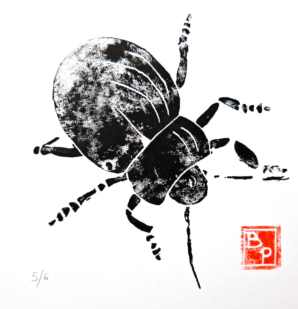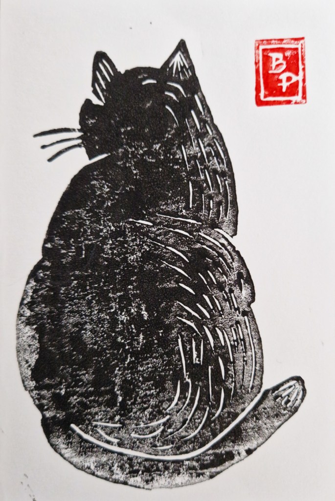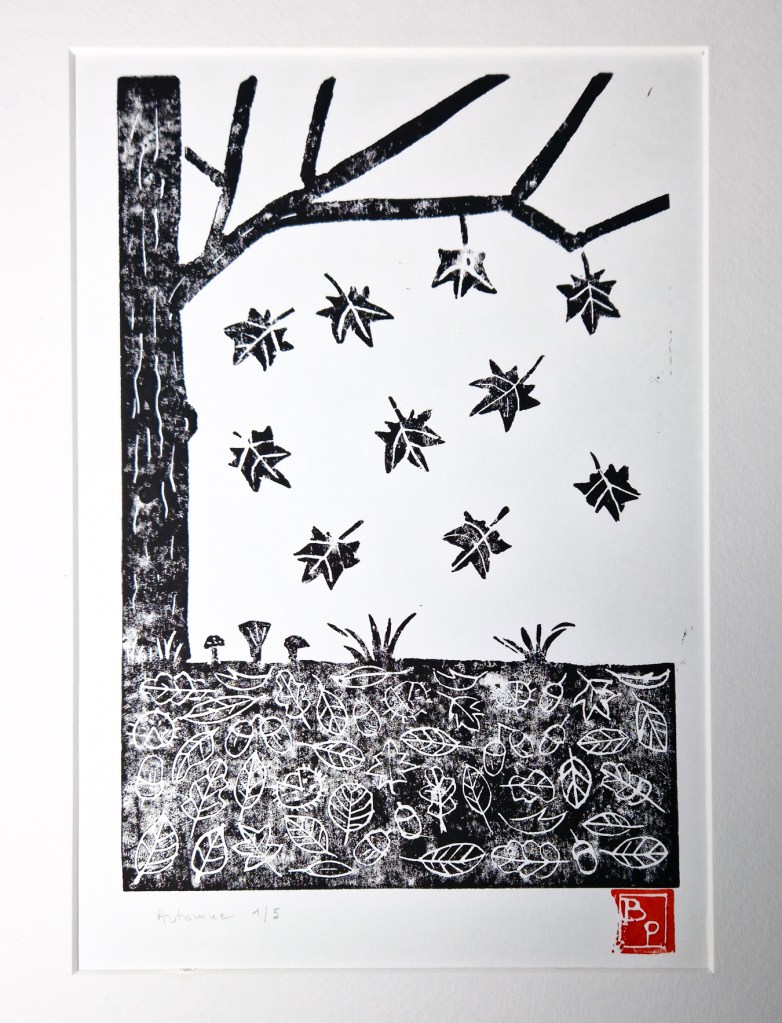 Par contre je trouve la linogravure plus difficile à réaliser : il faut imaginer le résultat final en réalisant le dessin préparatoire et l’encrage n’est pas évident pour qu’il soit bien régulier, comme on le constatera ci-dessous (!)