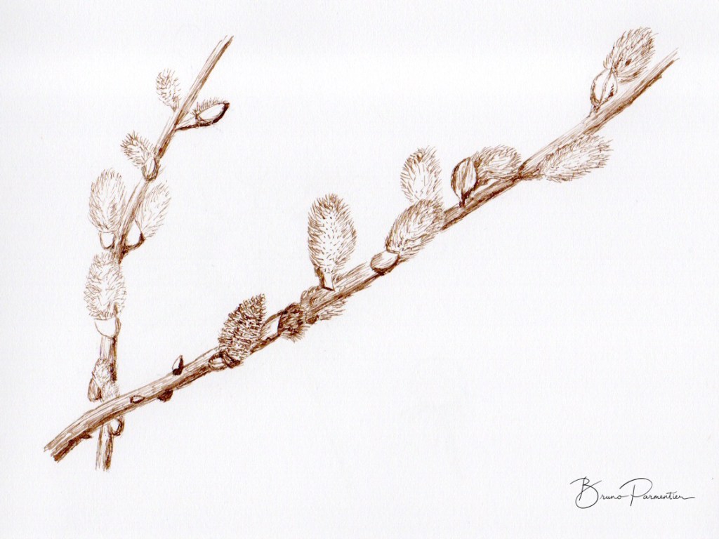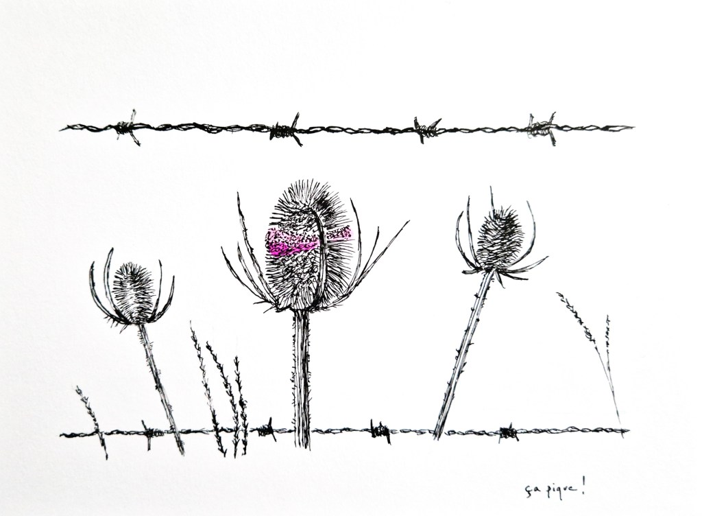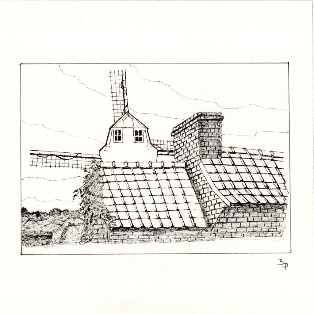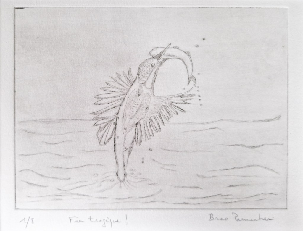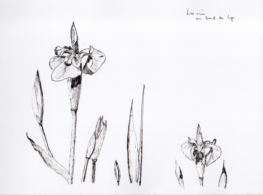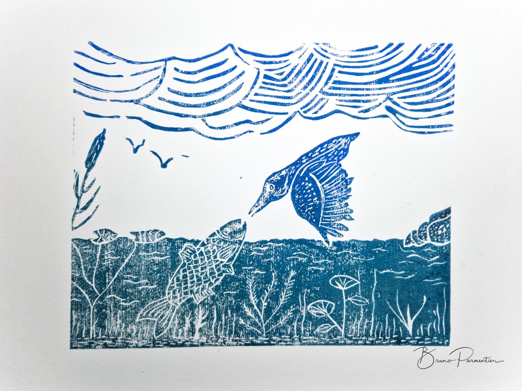 3 étapes : la photo (personnelle le plus souvent, trouvée sur Internet quand je n’ai pas eu la chance de photographier moi-même le sujet désiré ; elle me sert d’inspiration, je ne la reproduis pas forcément à l’identique), le dessin (au crayon ou à l’encre / brou de noix à la plume ; en général je l’ai réalisé sans penser a priori l’utiliser ultérieurement pour une gravure) et enfin la gravure imprimée.