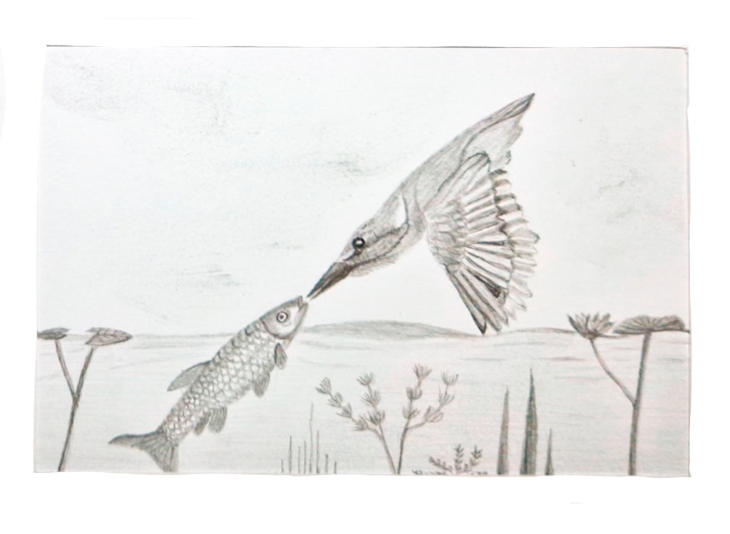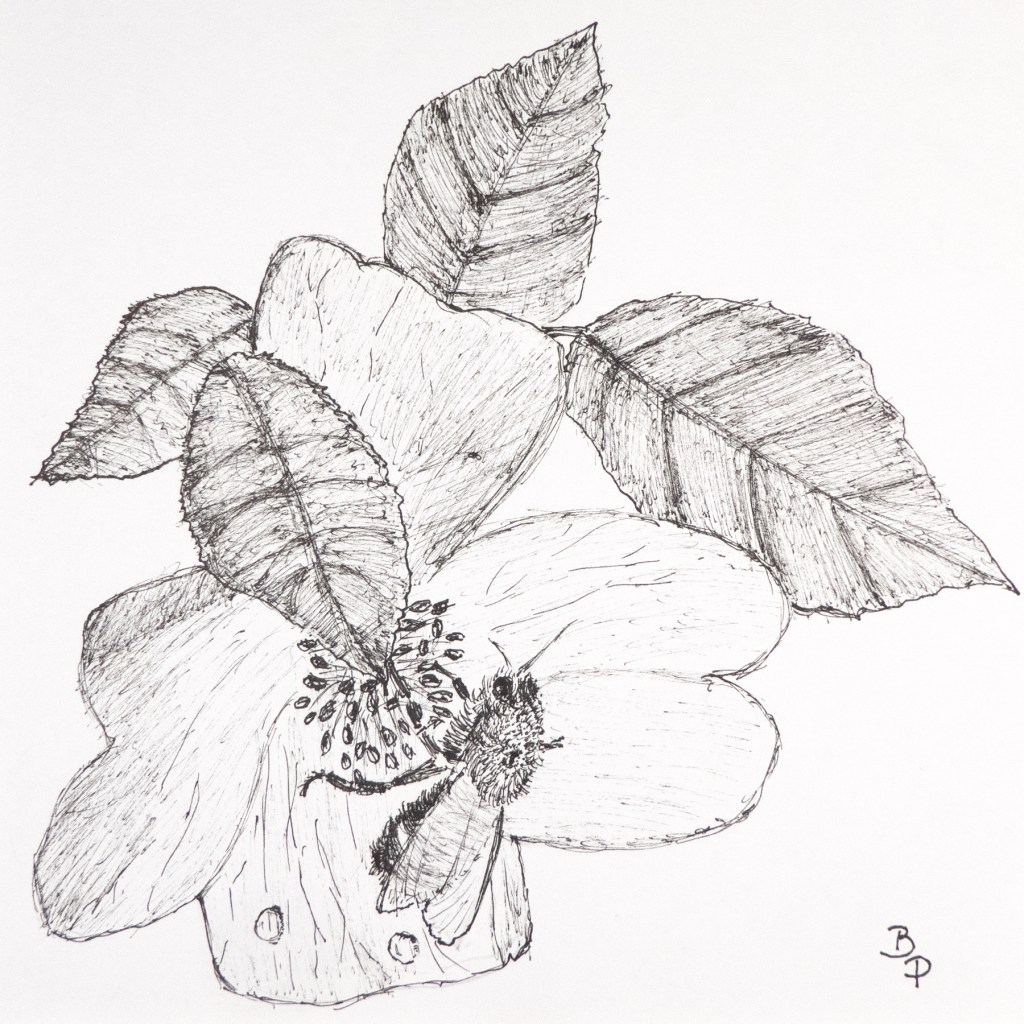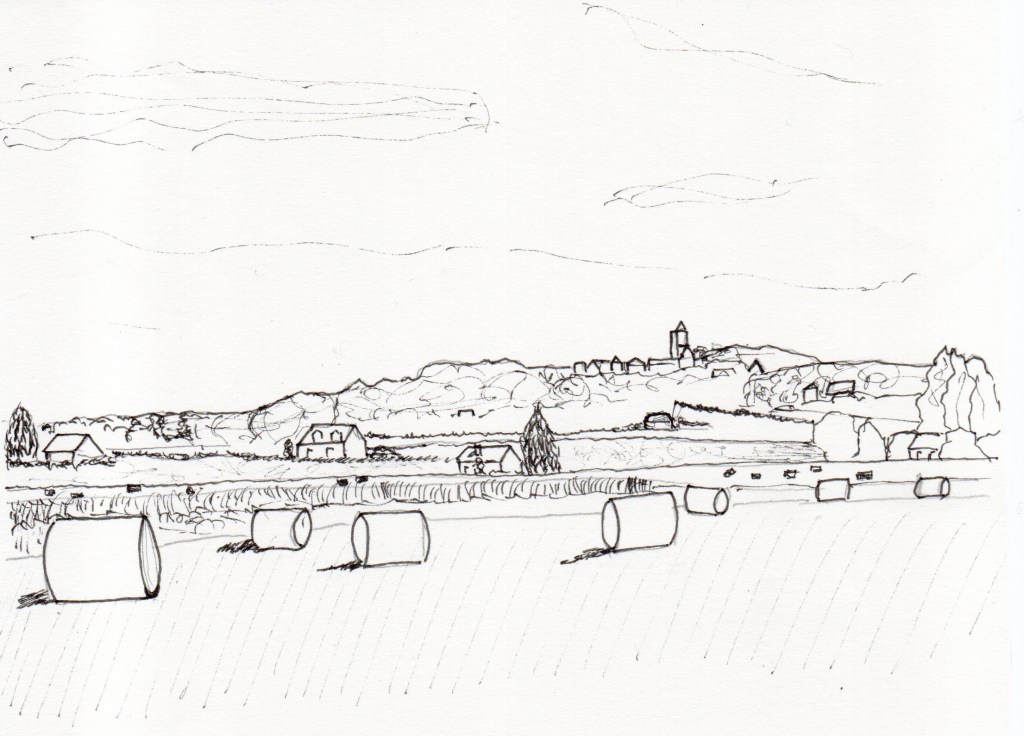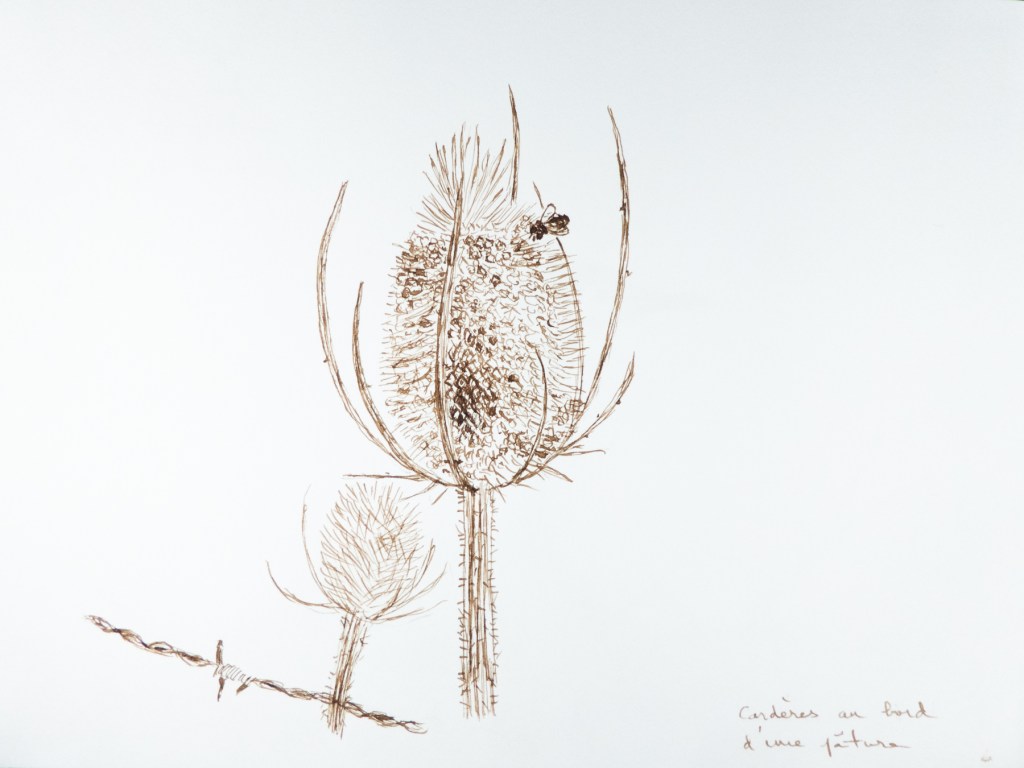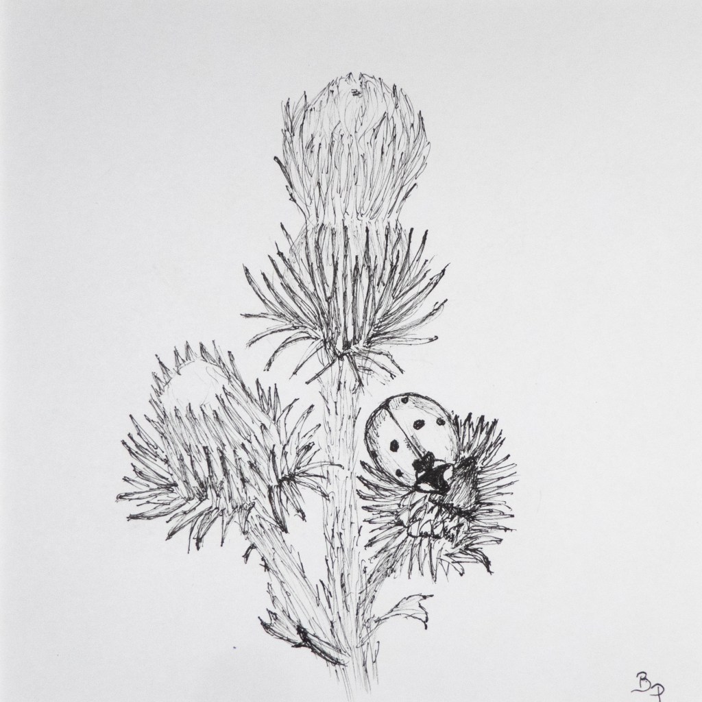 3 étapes : la photo (personnelle le plus souvent, trouvée sur Internet quand je n’ai pas eu la chance de photographier moi-même le sujet désiré ; elle me sert d’inspiration, je ne la reproduis pas forcément à l’identique), le dessin (au crayon ou à l’encre / brou de noix à la plume ; en général je l’ai réalisé sans penser a priori l’utiliser ultérieurement pour une gravure) et enfin la gravure imprimée.