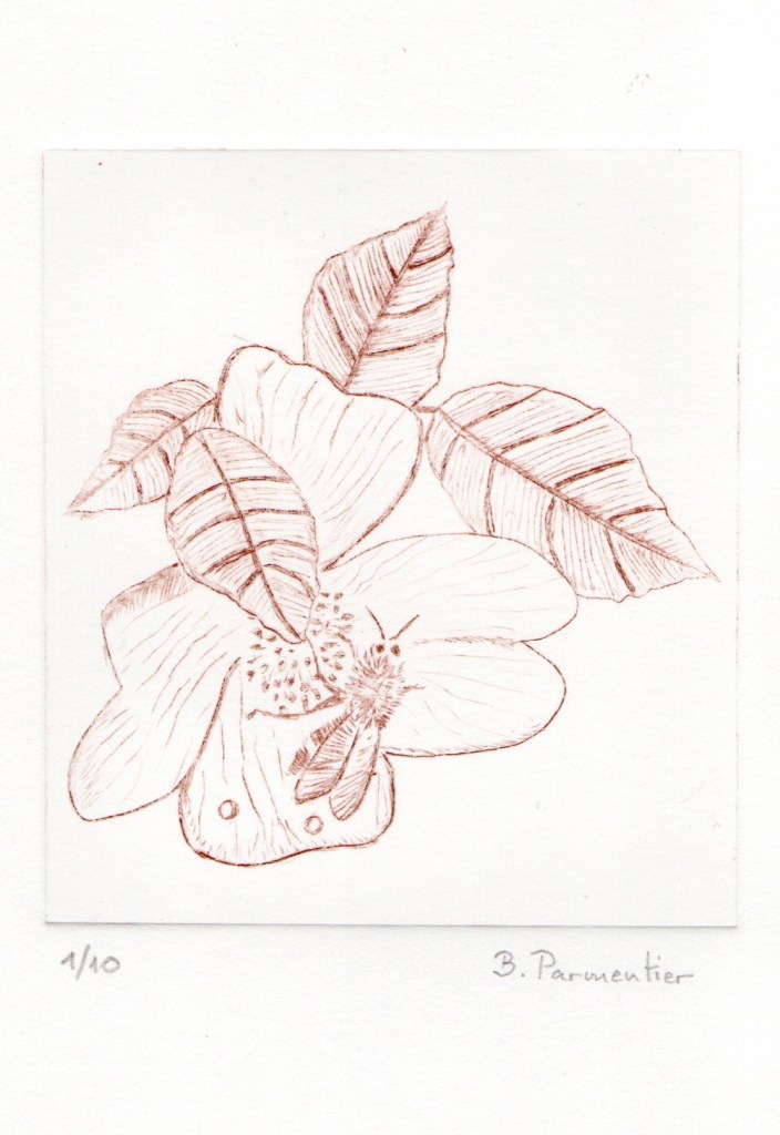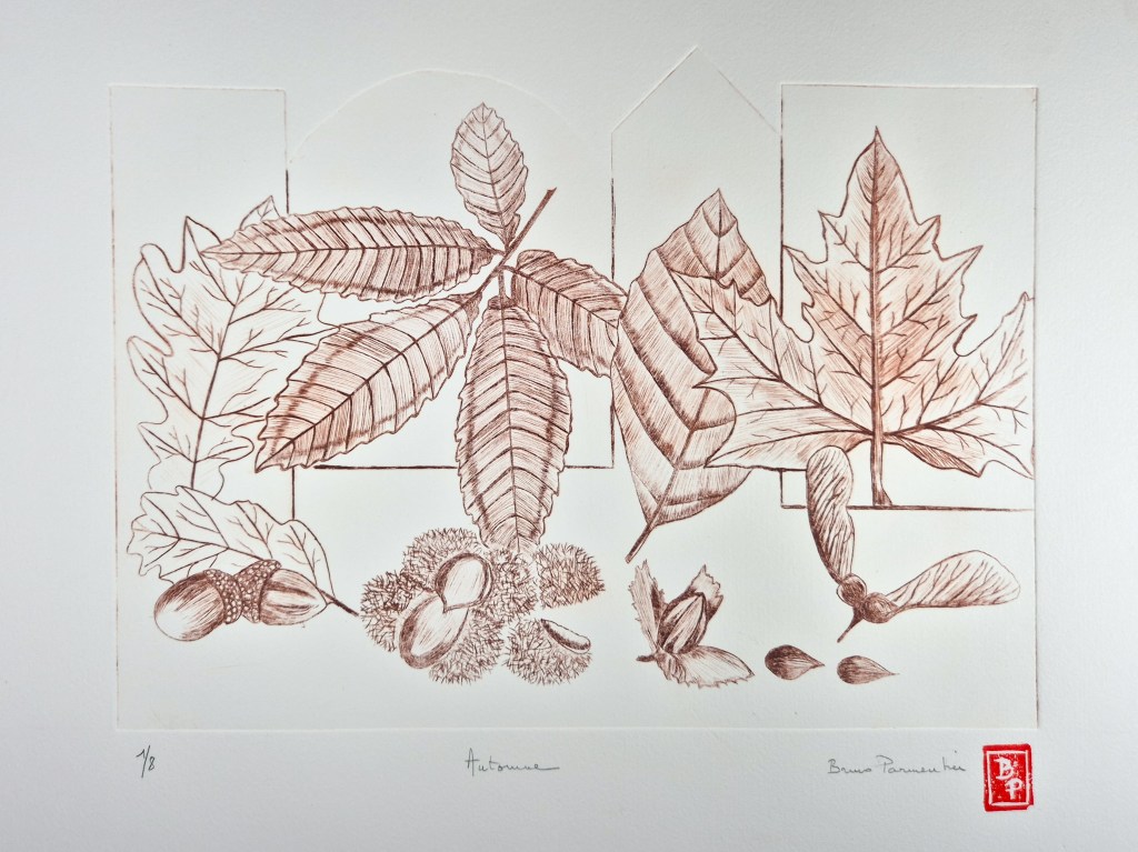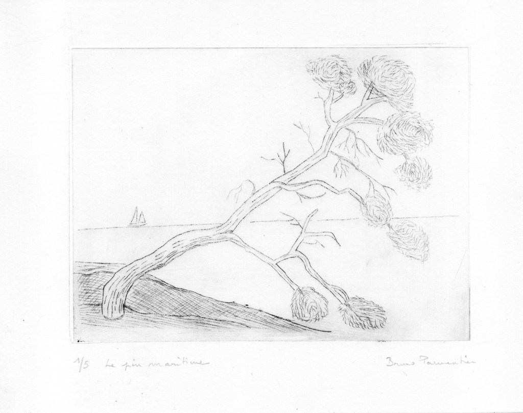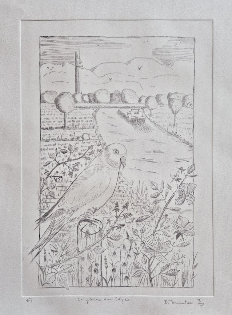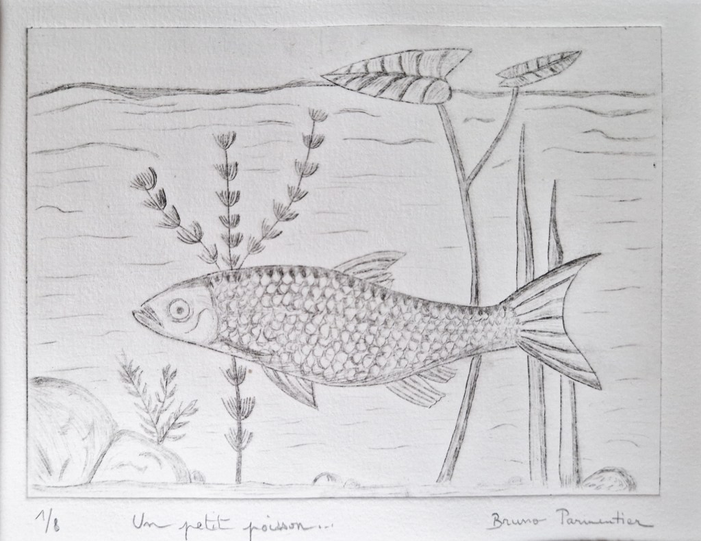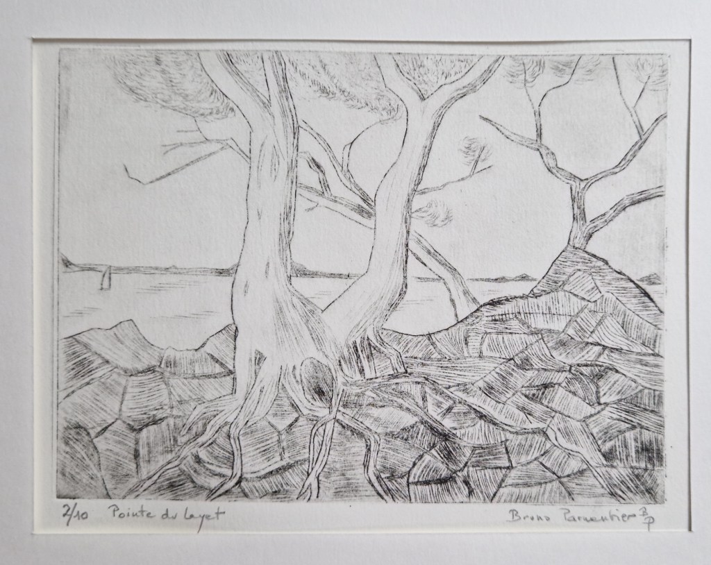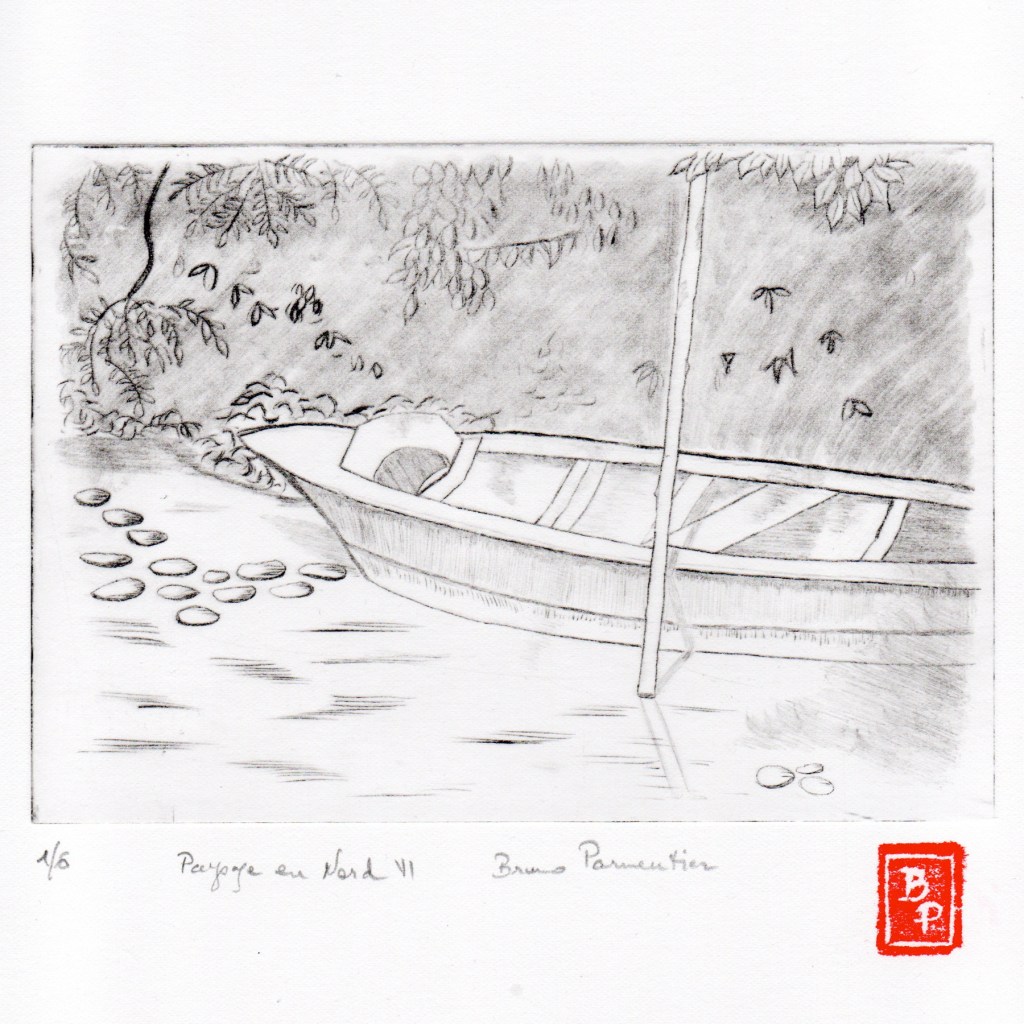 Quand on a l’habitude comme moi de dessiner à la plume ou au crayon et donc de réaliser les différentes valeurs de gris et de noir par des hachures, la réalisation du dessin préparatoire et la gravure de la plaque ne posent pas de gros problème. La partie la plus délicate est l’impression, qui dépend de la qualité du papier, de son taux d’humidité, du réglage de la pression des rouleaux de la presse, de la qualité de l’encrage puis de l’essuyage…