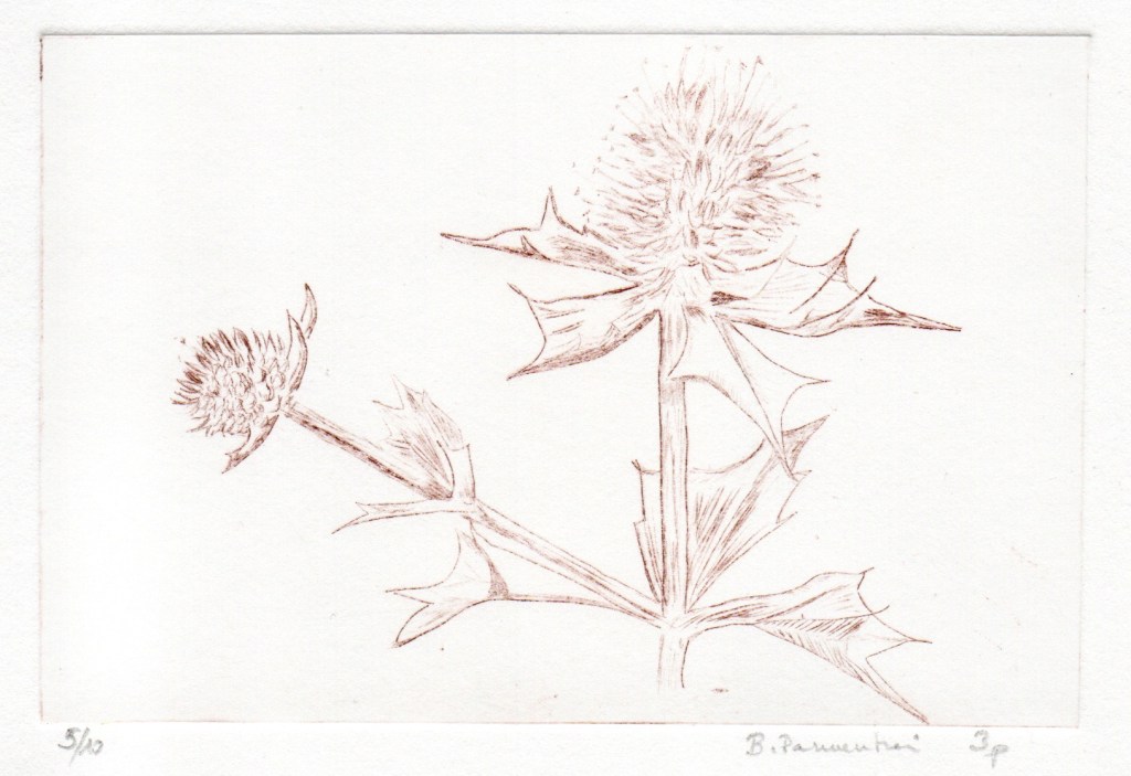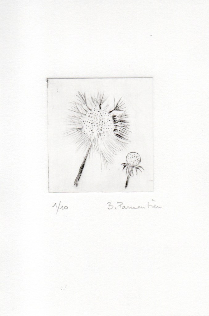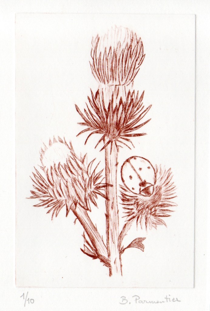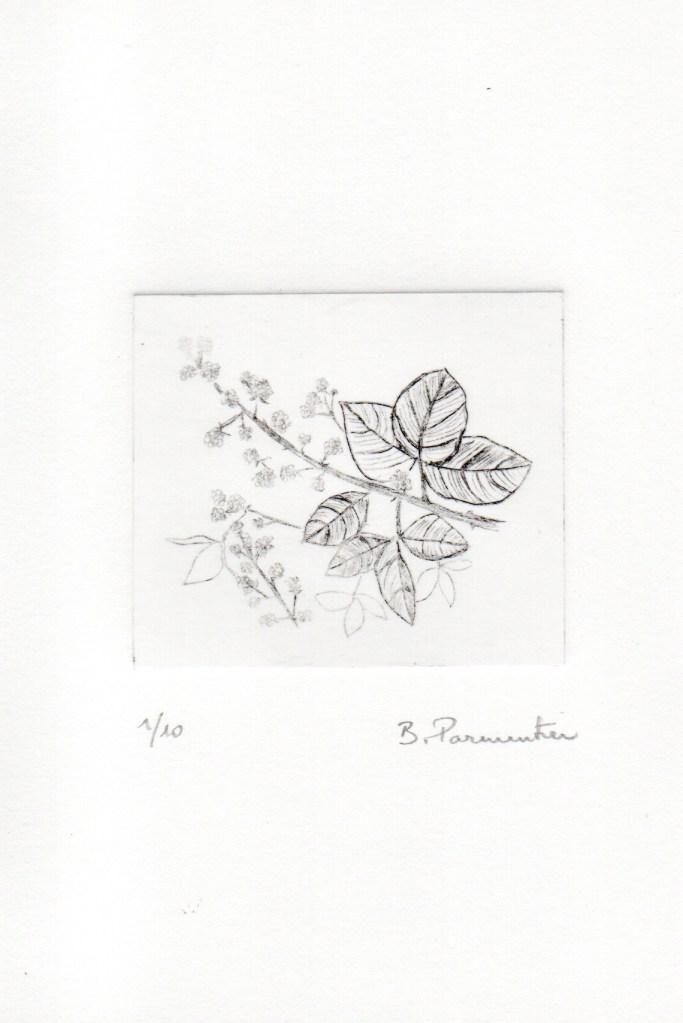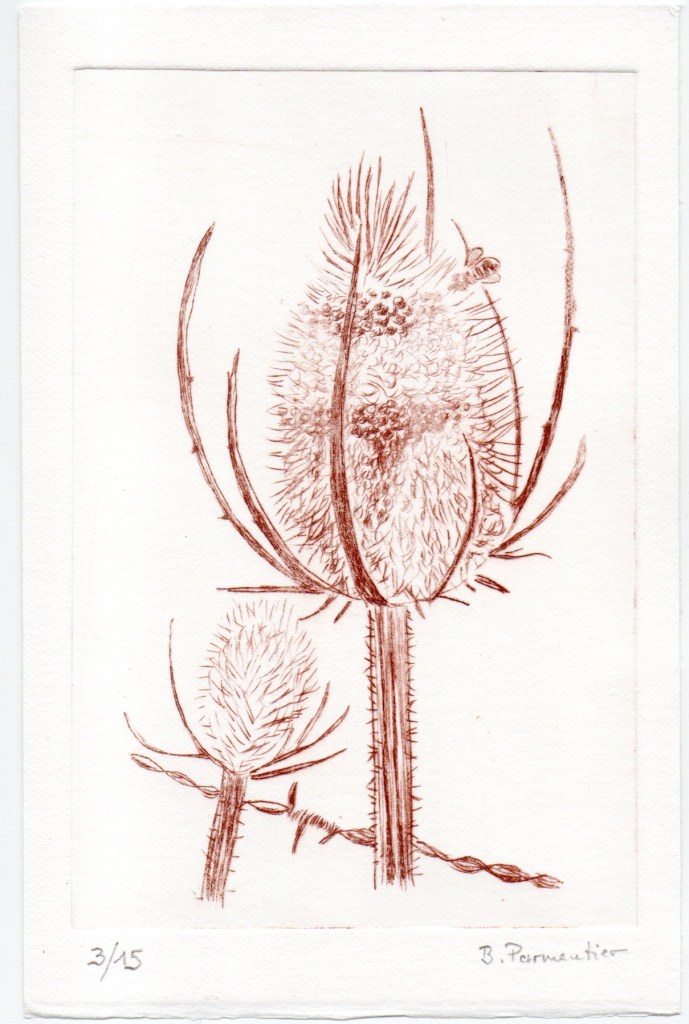 - l’avantage de la pointe sèche c’est qu’on n’utilise pas de vernis et de produits chimiques pour « mordre » la plaque de métal, technique de l’eau forte, moins accessible à des amateurs à mon sens.