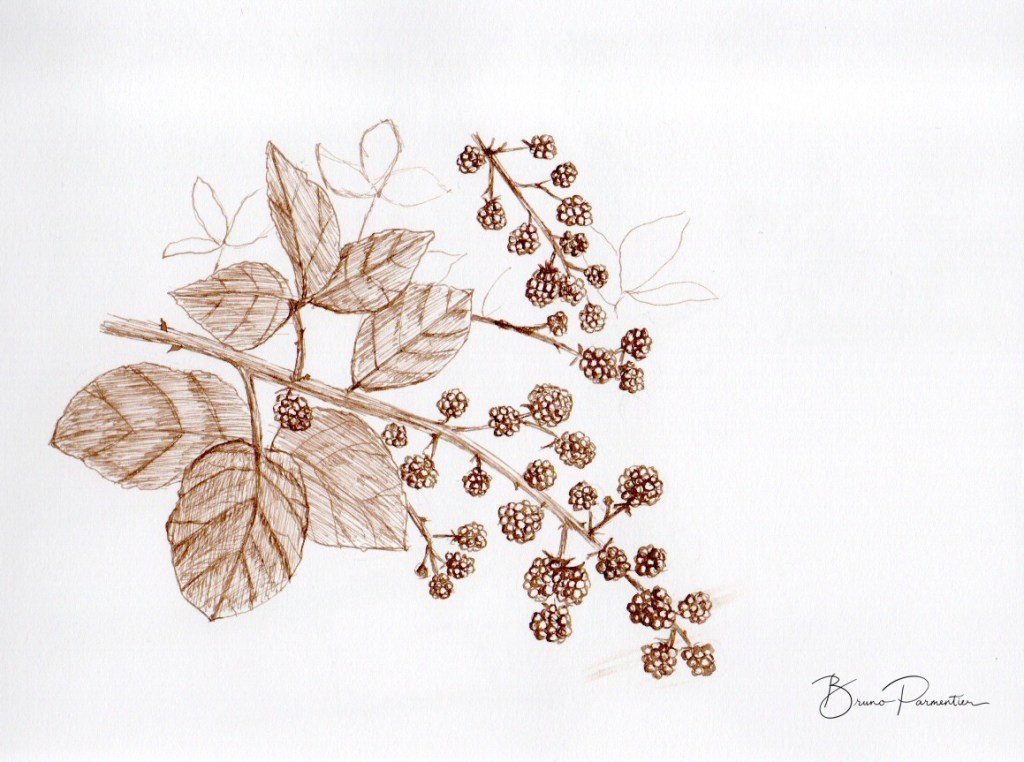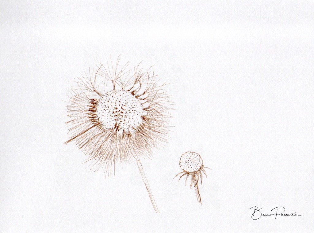 Réalisé à partir d’un dessin à la plume et encres de couleur Sennelier, lui-même réalisé d’après un montage Photoshop à partir de diverses photos de feuilles et de graines trouvées sur internet (cliquer pour agrandir).