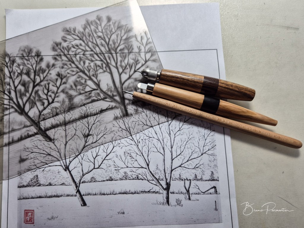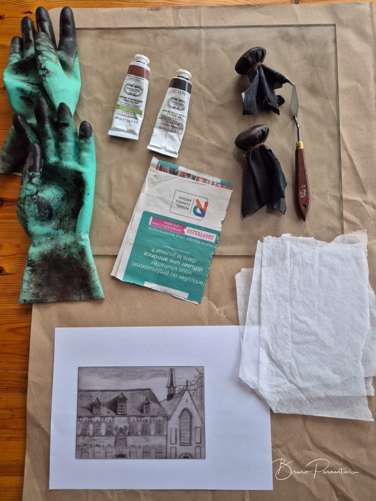 Sur la photo ci-dessous le dessin d’inspiration, la plaque de rhénalon (ici après impression : avant les creux gravés ne sont pas noirs mais transparents, ce qui nécessite de travailler avec un bon éclairage), la pointe sèche, le multi-lames et la roulette.