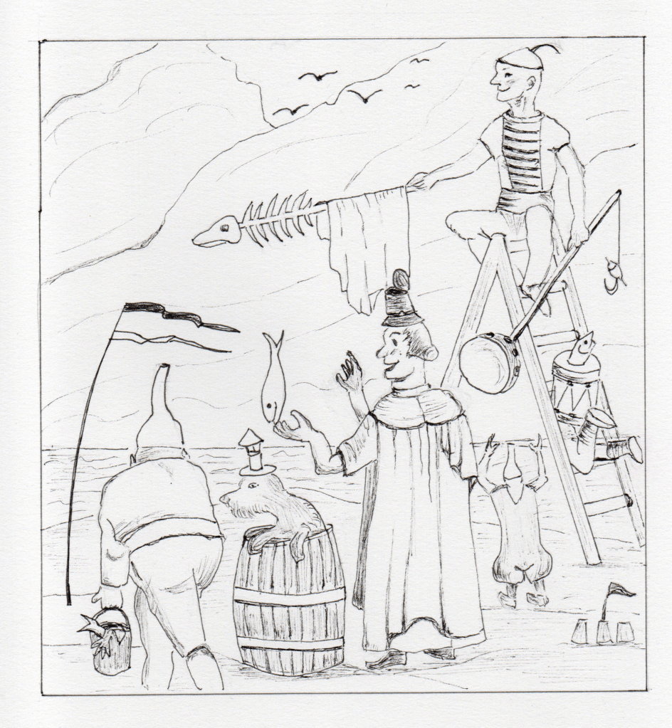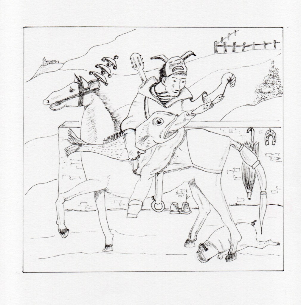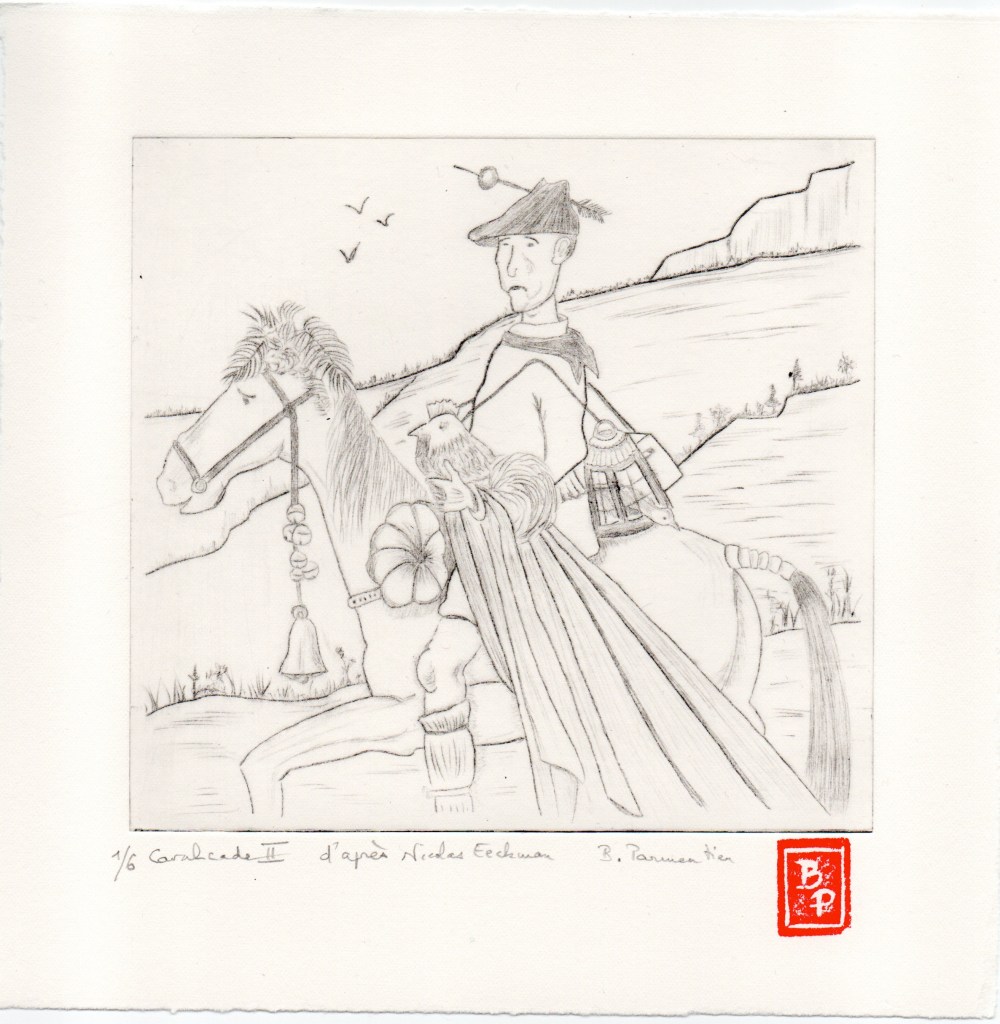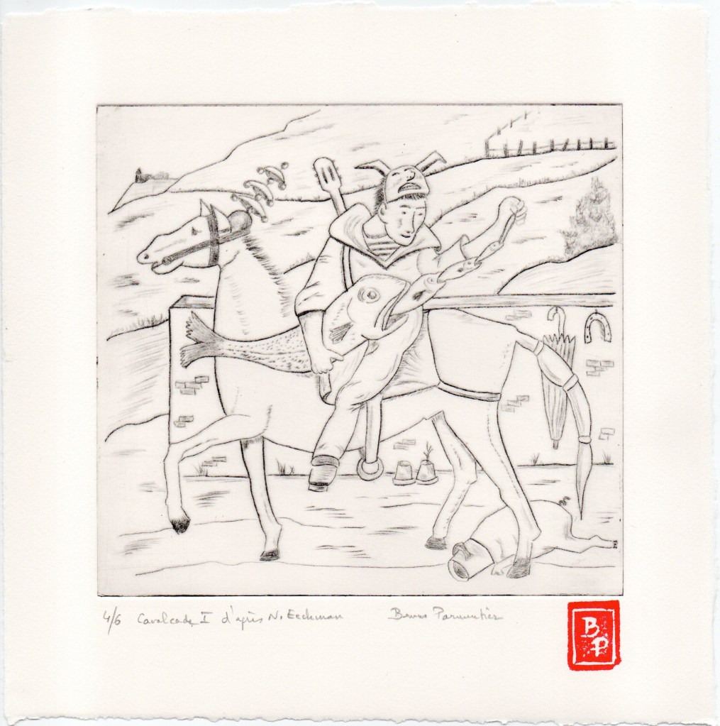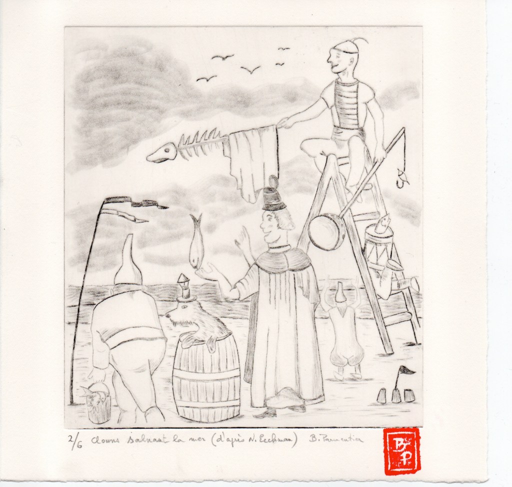 Gravures à la pointe sèche sur rhénalon (plexi). Impression à l’encre Charbonnel sur papier Magnani Pescia 100% coton 300gr. Matrice 14x 15 cm environ (Clowns et Cavalcade) – 20×24 cm environ (Poissons et Till)