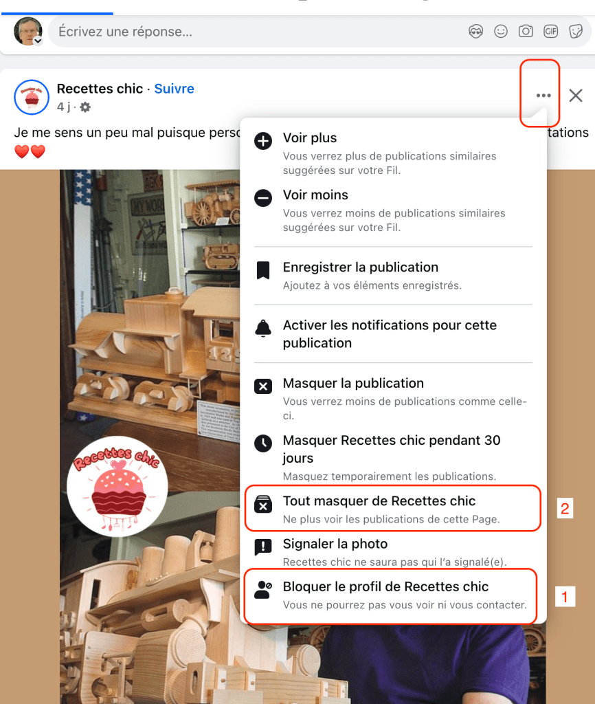 - Dans ce cas, ne likez pas (mention j’aime), ne laissez pas de commentaire admiratif. Si vous l’avez fait et que vous recevez une demande de contact, ne répondez pas. Bloquez le profil et masquez la page FB en question : voir ci-dessous.