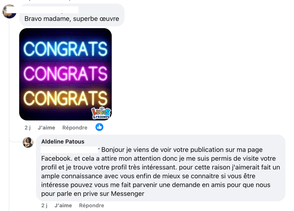 - Regarder les réponses aux commentaires : s’il y a des demandes de contact, c’est une page de brouteurs voir ci-dessous