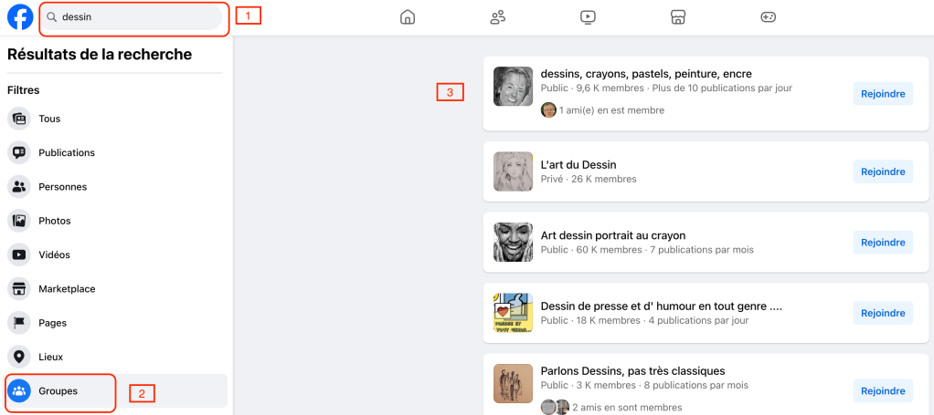 2ème conseil : recherchez des groupes correspondant à vos centres d’intérêt. Personnellement je suis sur plusieurs groupes de photographes et de peintres et dessinateurs et m’en trouve bien. certains sont passionnants et offrent des opportunités (contacts, expositions…).