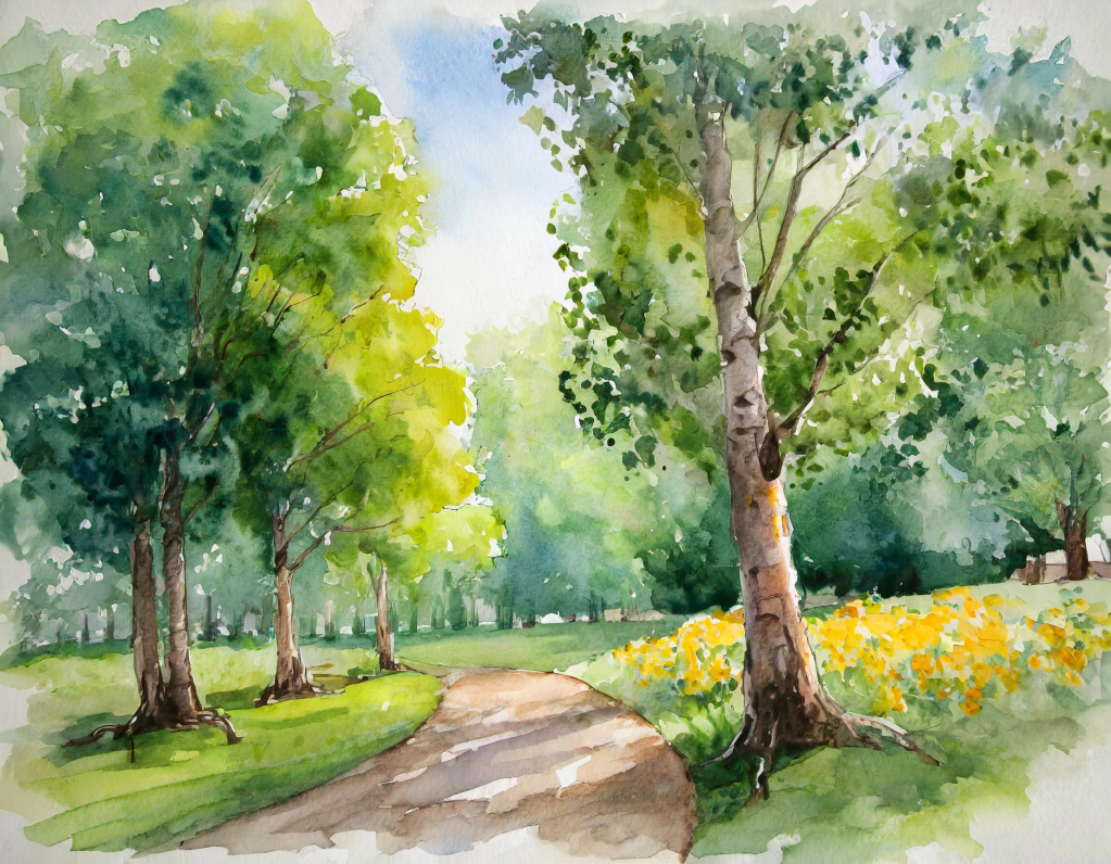 Exemple : j’ai demandé à Firefly (outil pro d’IA générative d’Adobe) un « sous-bois au printemps façon aquarelle » et obtenu cette image :